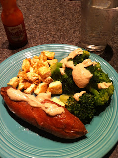 After the class I came home and the family had dinner which was a baked sweet potato, steamed broccoli and some stir fried tofu. The sauce you see on top of the potato and broccoli is tahini sauce and I added some more Frank's Hot Sauce.